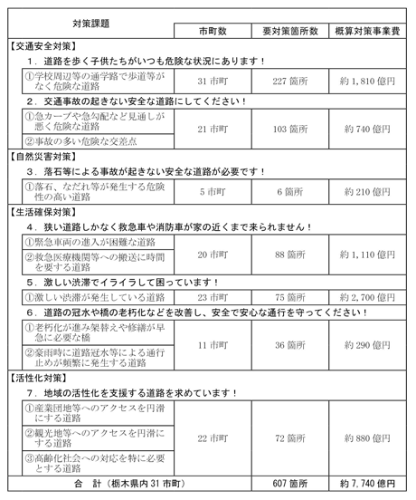 これらのことから、私ども、道路整備促進期成同盟会栃木県協議会では今後の活動について、ただ単に道路整備予算の確保を求めていく行動だけでなく、道路整備の必要性や緊急性・地域住民の要望等を各市町が主体となり、栃木県民の声として取りまとめを行ったところであります。